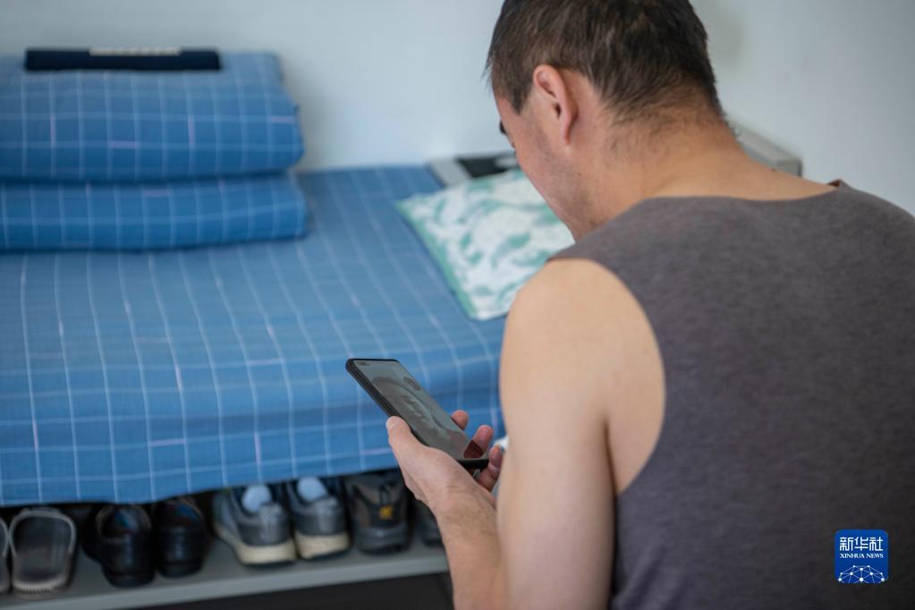在拉萨机辆整备中心的宿舍里,黄起岗和女儿视频通话(1月11日摄)。