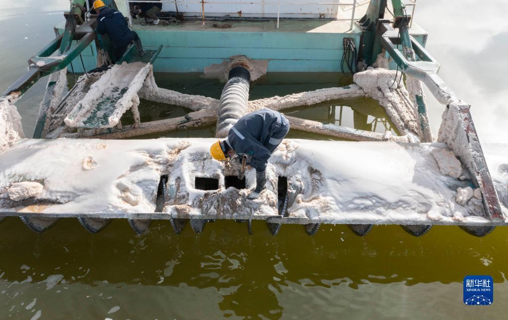 2月2日,贺连福与同事在清除水采船船身上的卤水结晶(无人机照片)。
