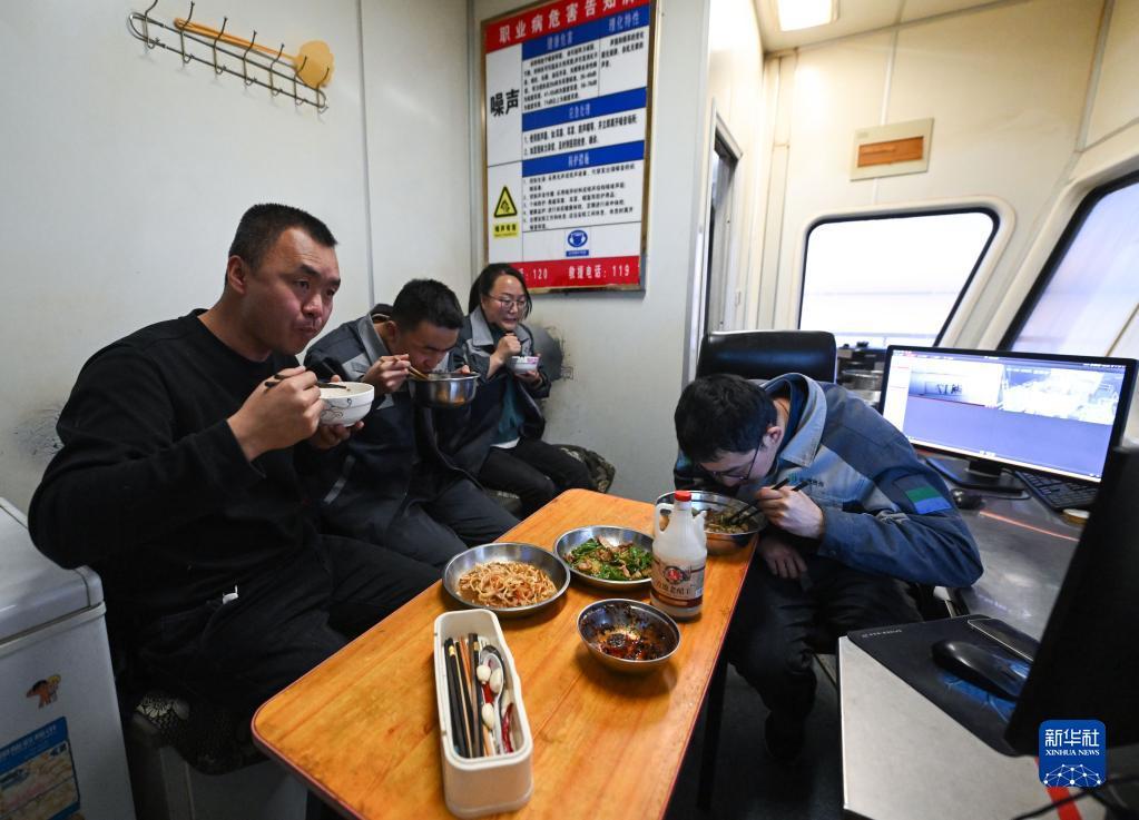 2月2日晚间,贺连福(左一)与同事在水采船上吃晚饭。