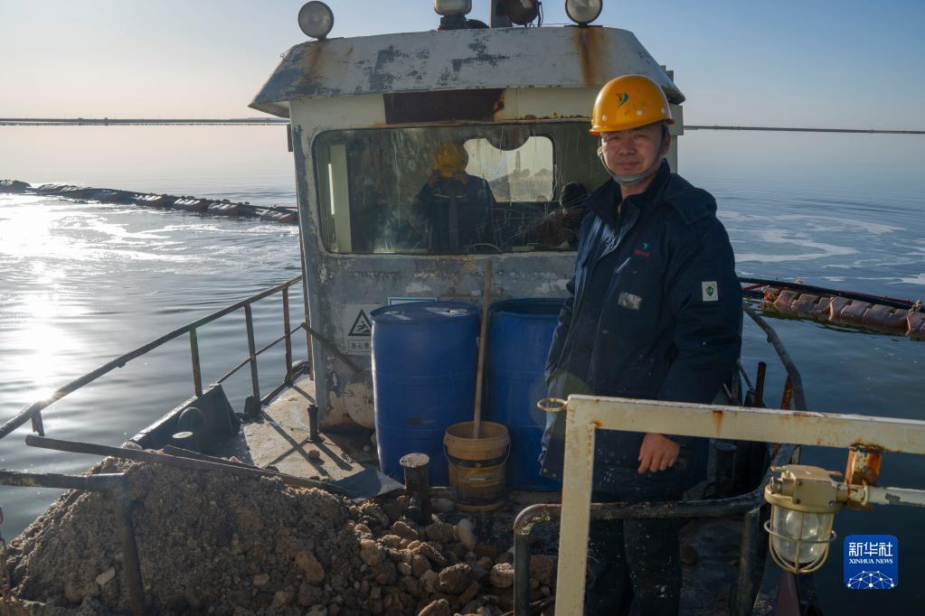 2月2日,贺连福(右)与同事驾驶工作船运输卤水结晶。