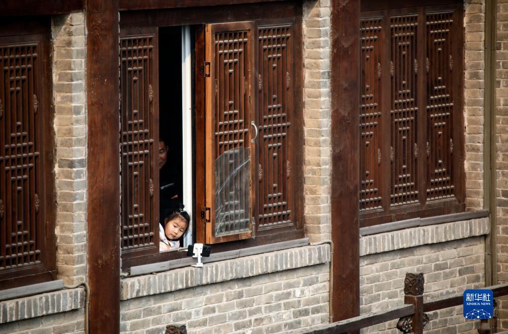 2月6日,小朋友在窗边观看庙会表演。