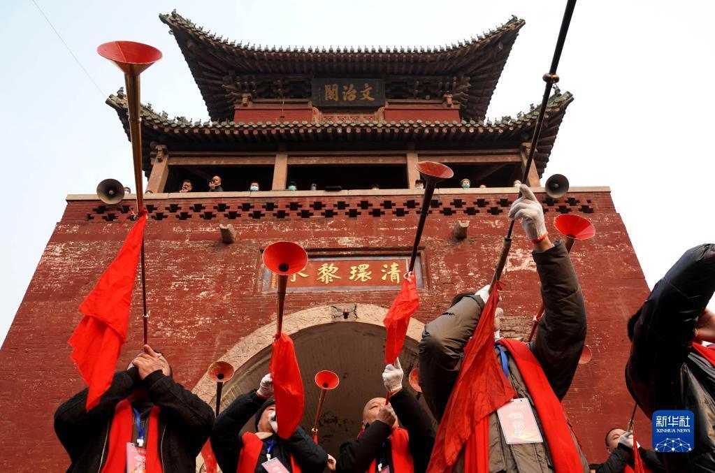 2月6日,社火团队的成员在庙会上奏乐。