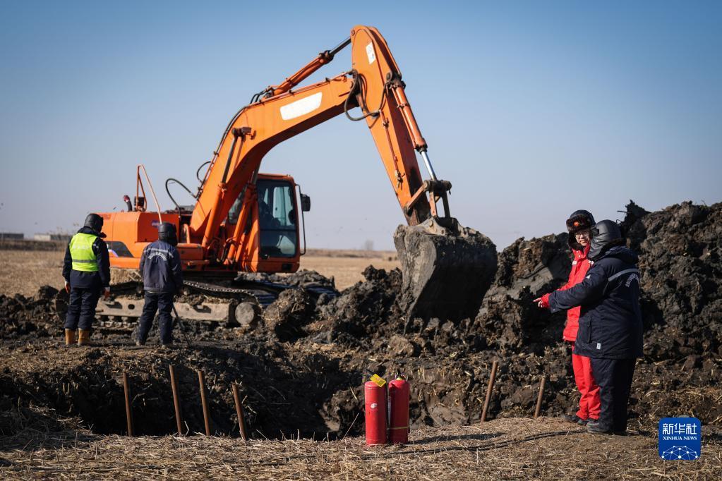 2月6日,中国石油辽河油田兴隆台输气分公司巡线工人(右二)在施工现场与施工人员交流维修情况。