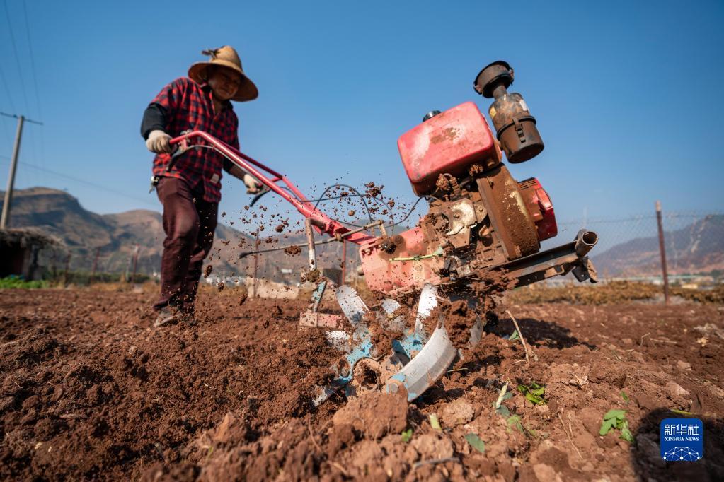 2月7日,在云南省大理白族自治州南涧彝族自治县杨免庄村,农民在耕地。