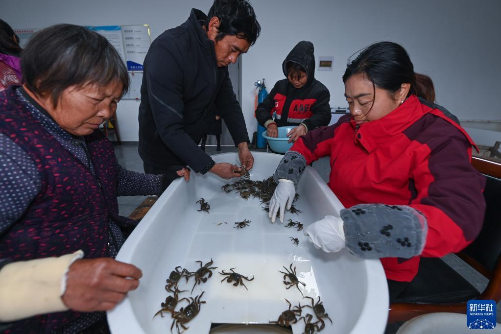 2月8日,在位于湖州市织里镇的湖州湖星生态农业有限公司的车间内,工作人员和养殖户在筛选太湖蟹苗。