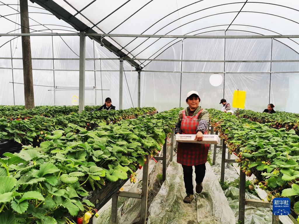2月8日,工人在泗渡农场的大棚里采摘草莓。新华社记者 郑明鸿 摄