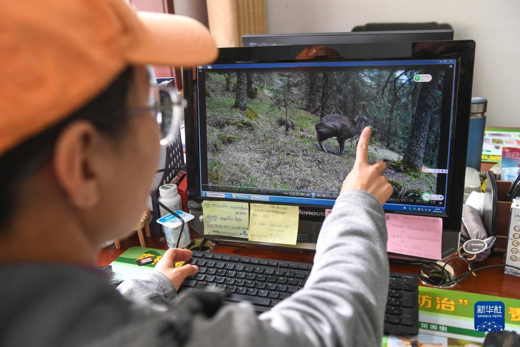 2月20日,在内蒙古贺兰山国家级自然保护区管理局,工作人员阿丽玛展示红外相机拍摄到的国家一级保护动物马麝。