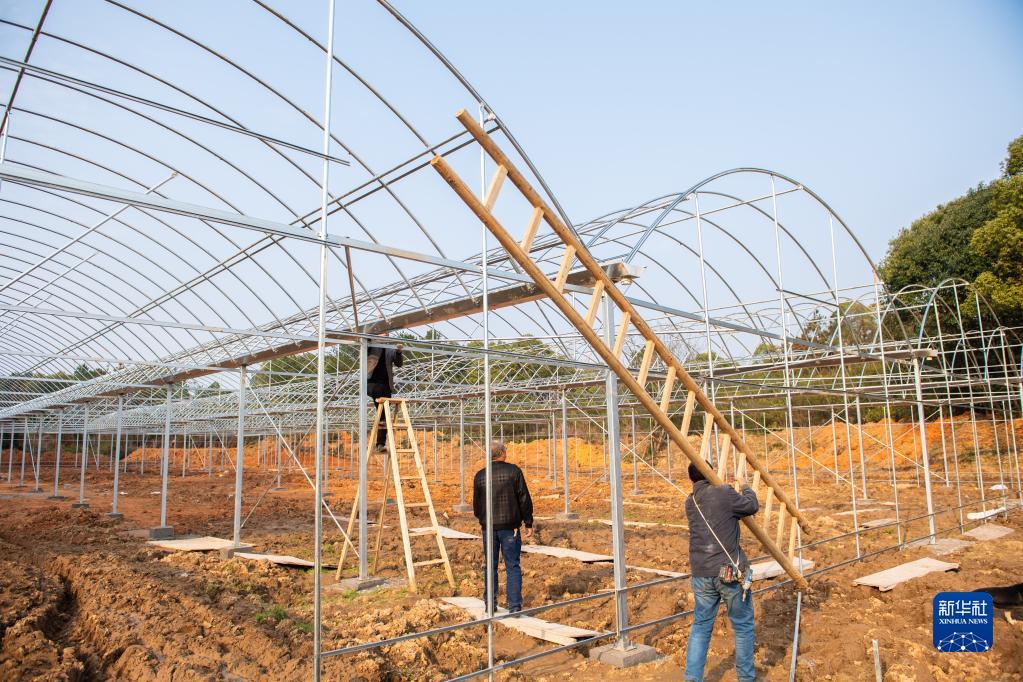 2月21日,在醴陵市东富镇东富村,村民在搭建育秧大棚。