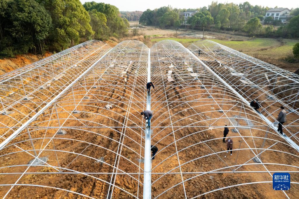 2月21日,在醴陵市东富镇东富村,村民在搭建育秧大棚(无人机照片)。