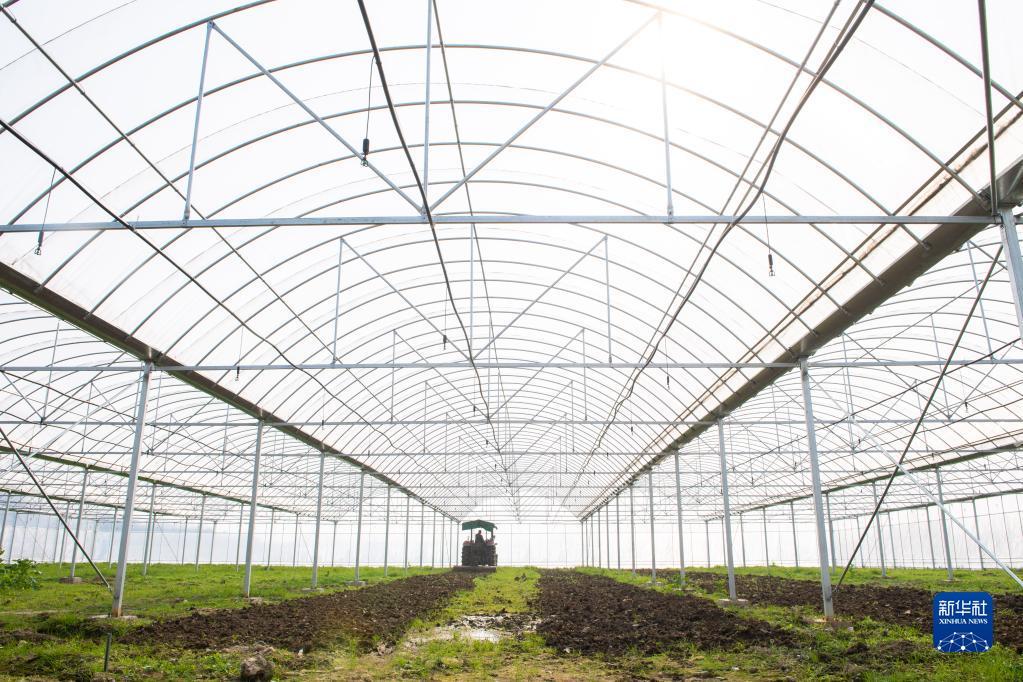 2月21日,在醴陵市沈潭镇庞龙村,村民驾驶农机在新修建的育秧大棚内翻土备耕。