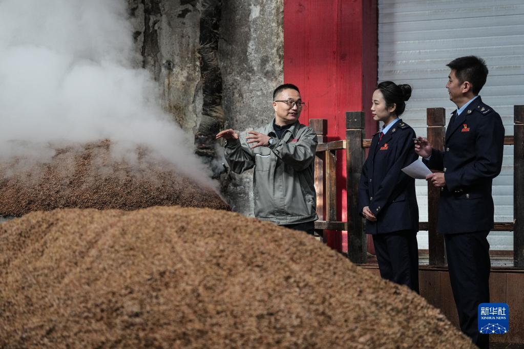 2月21日,国家税务总局阜新市税务局的工作人员在阜新三沟酒业的生产车间里向企业的工作人员了解生产情况,同时介绍税务政策、解答税务问题。