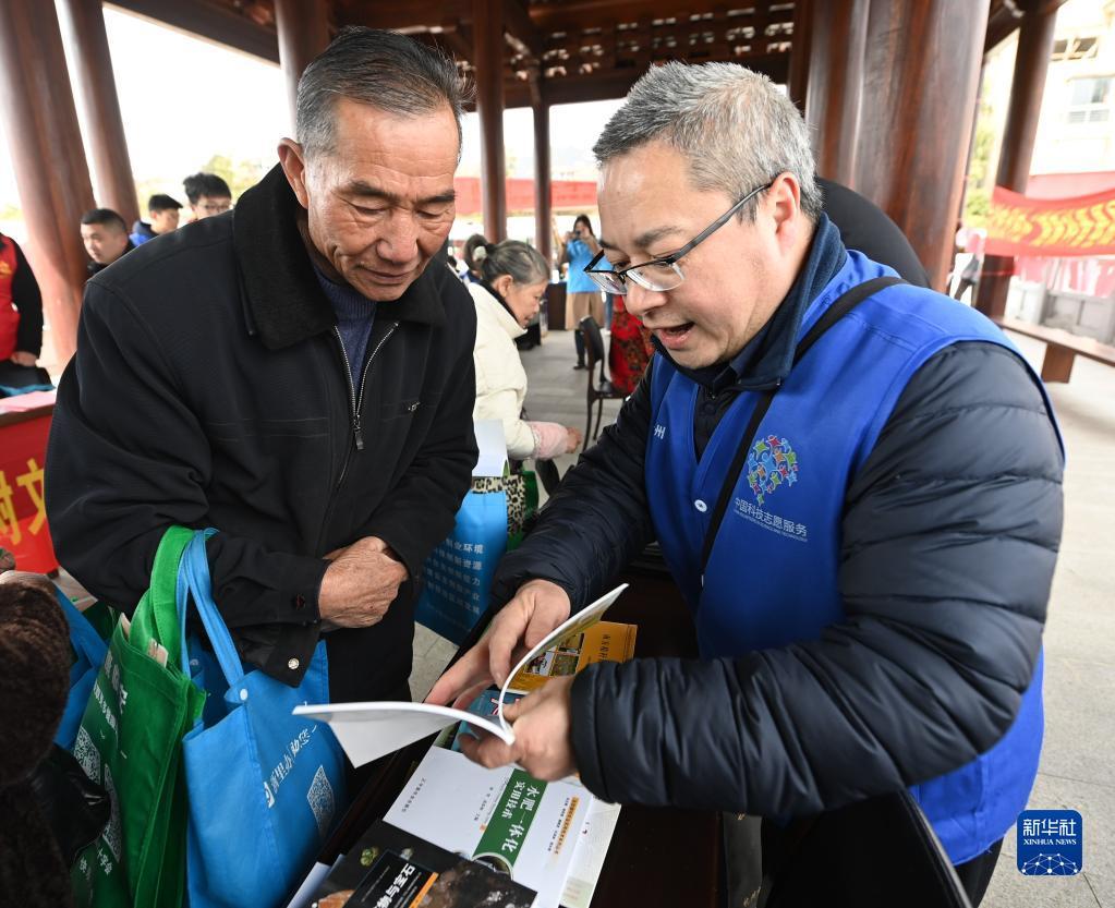 2月22日,在杭州市临安区昌化镇的东坡桥上,临安区科学技术协会“三服务”小分队的党员志愿者(右)给当地百姓讲解科普书籍。