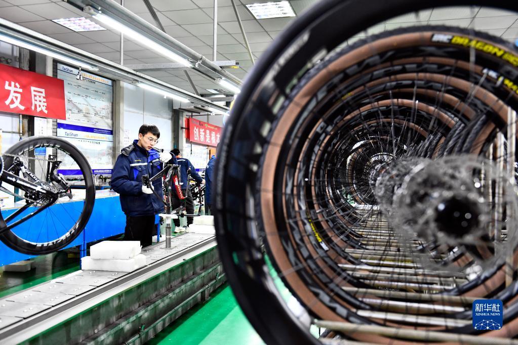 2月21日,在泰山瑞豹复合材料有限公司,工作人员在生产碳纤维自行车。