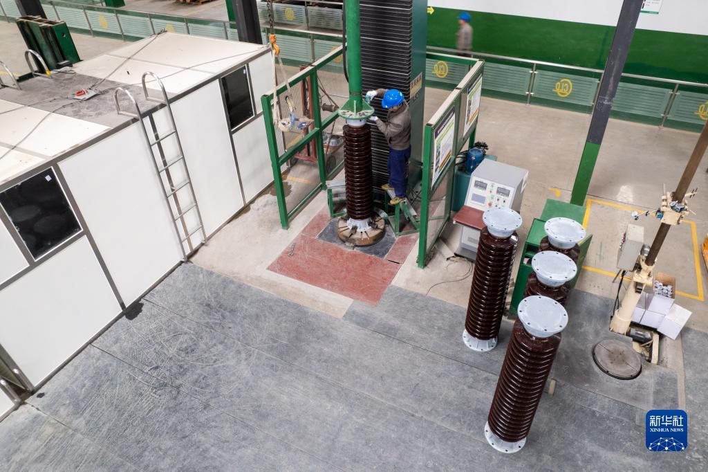 2月22日,在位于醴陵市的湖南阳东电瓷电气股份有限公司生产车间,工作人员在检测瓷绝缘子的力学性能(无人机照片)。
