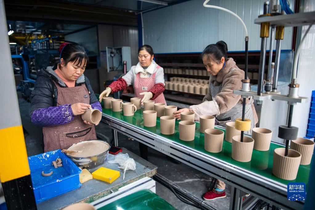 2月22日,在位于醴陵市的湖南华联溢百利瓷业有限公司生产车间,工作人员在安装瓷杯握柄。