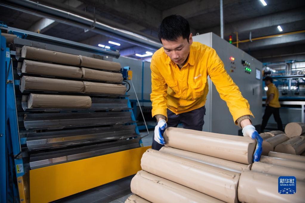 2月22日,在醴陵陶润实业发展有限公司生产车间,工作人员把泥坯放入陶瓷自动滚压成型装置。