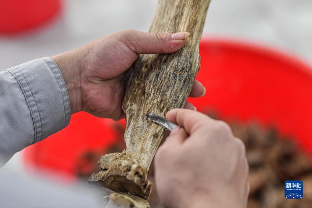 2月22日,工人在海南省儋州市那大沉香基地勾香。