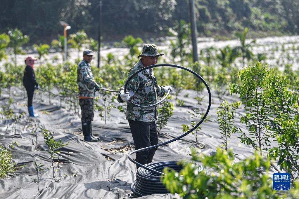 2月22日,在海南省儋州市那大沉香基地,工人为奇楠沉香幼苗布设滴灌管道。