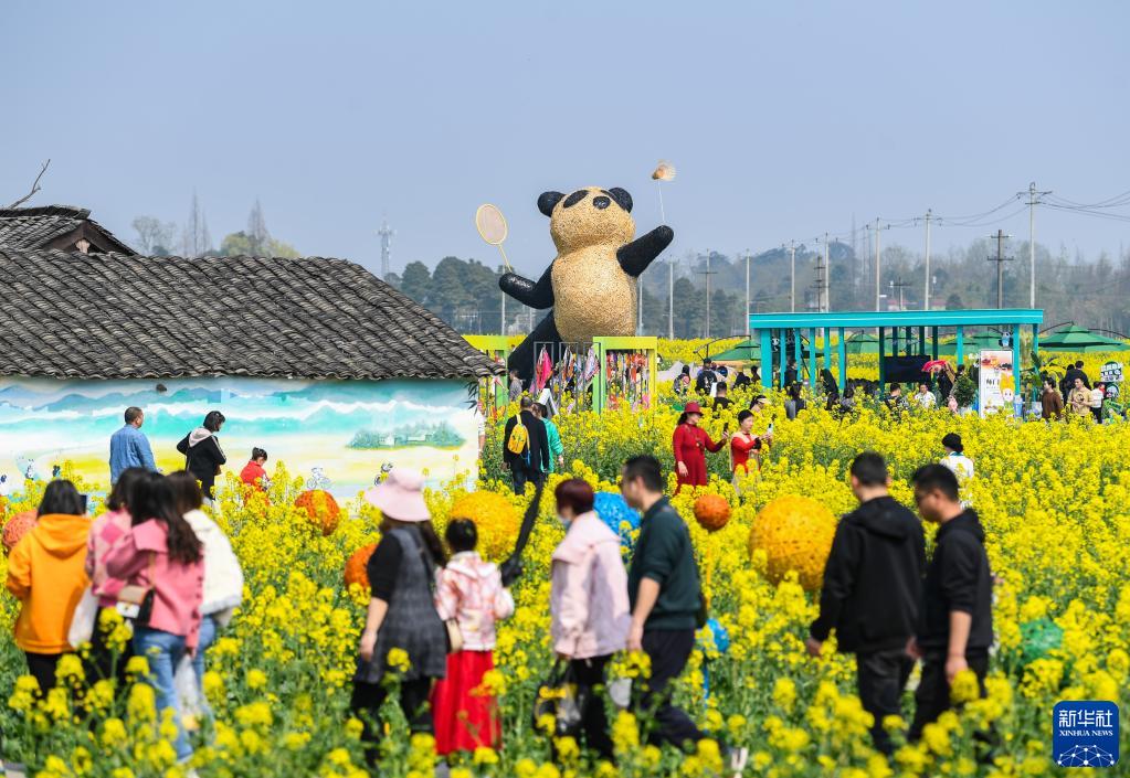近日,位于四川成都崇州市的数万亩油菜花竞相绽放,吸引游客前来踏春观光。