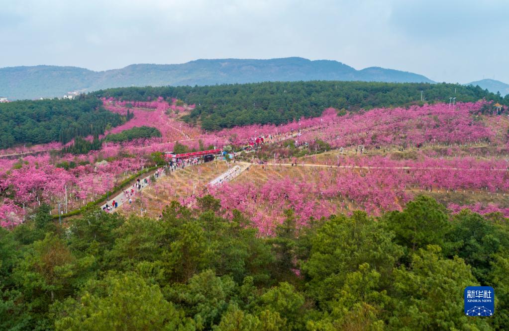 近日,云南省曲靖市马龙区沈家山樱花谷的400余亩樱花陆续绽放,吸引游客前来观光游览。