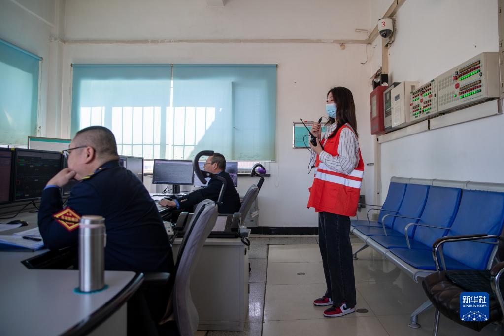 3月6日,在杜尔伯特火车站信号楼,女子检验班的王可正在观察车辆运行情况。