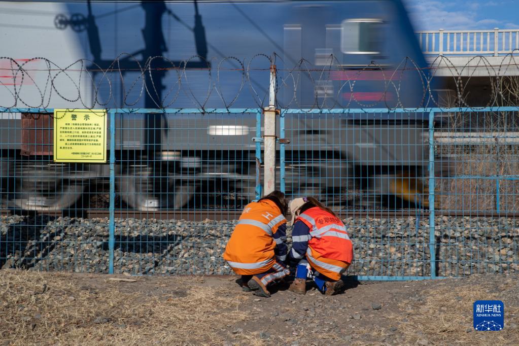 3月6日,在滨洲线199公里处,女子检验班班长曹蕊(左)和张丹进行作业。
