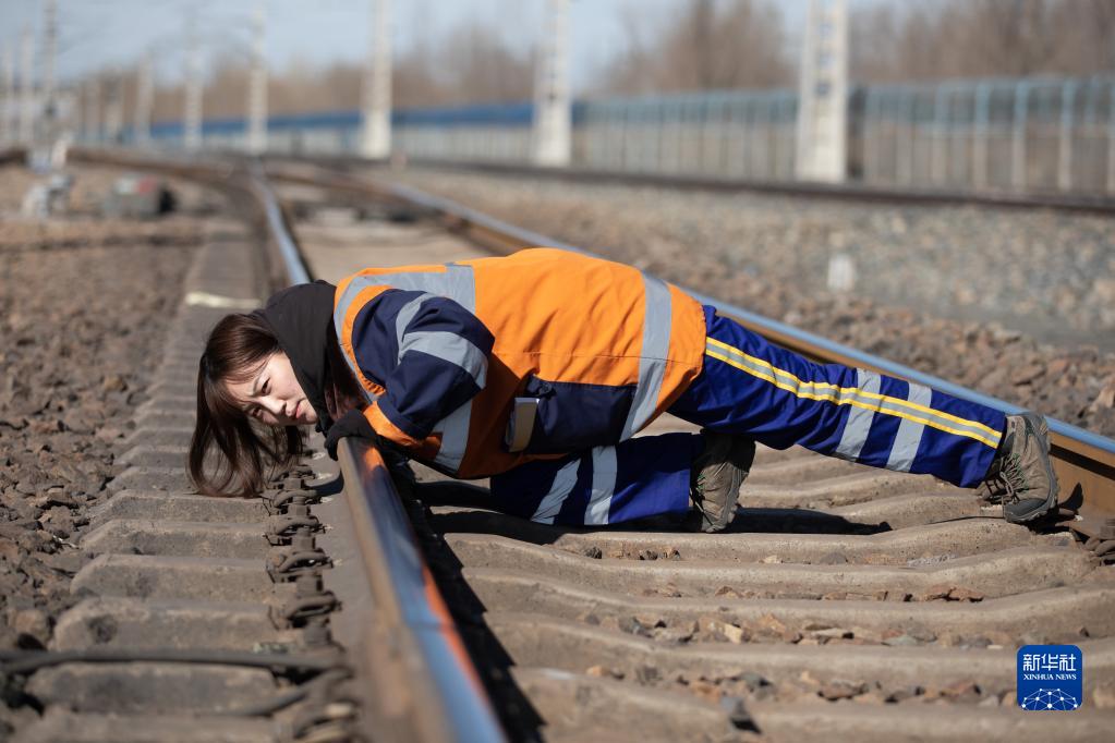 3月6日,在杜尔伯特火车站9号线,女子检验班的曹妍趴在铁道线上观察线路高低。