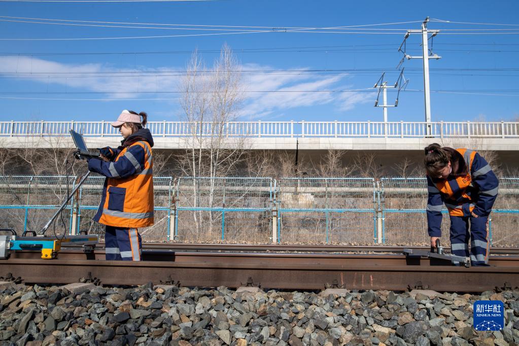 3月6日,在滨洲线199公里处,女子检验班的苑鹏鹏(左)和曹蕊进行作业。