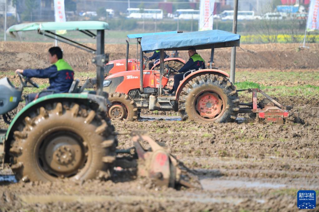 当日,在湖南省湘潭市湘乡市举行的湖南省供销合作社农业社会化服务大联盟成立仪式现场,种粮能手在200亩高标准农田里操作农机设备进行“比武”,通过拖拉机犁田、旋耕机翻耕、植保无人机飞防等农机技能比赛提升农业服务水平,助力春耕备耕。