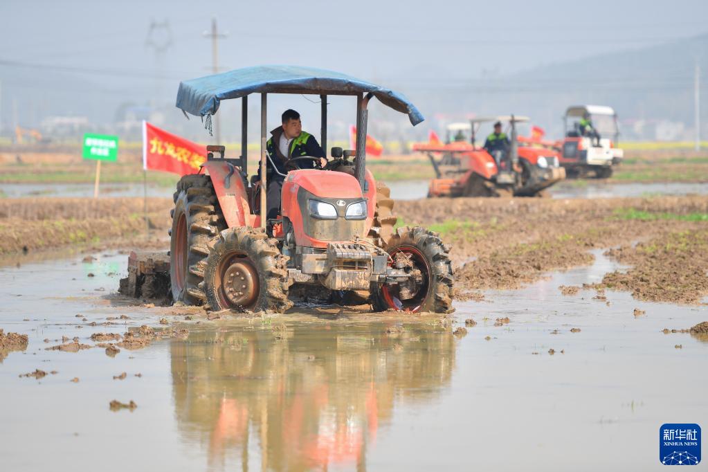 当日,在湖南省湘潭市湘乡市举行的湖南省供销合作社农业社会化服务大联盟成立仪式现场,种粮能手在200亩高标准农田里操作农机设备进行“比武”,通过拖拉机犁田、旋耕机翻耕、植保无人机飞防等农机技能比赛提升农业服务水平,助力春耕备耕。