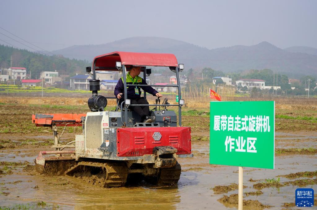 当日,在湖南省湘潭市湘乡市举行的湖南省供销合作社农业社会化服务大联盟成立仪式现场,种粮能手在200亩高标准农田里操作农机设备进行“比武”,通过拖拉机犁田、旋耕机翻耕、植保无人机飞防等农机技能比赛提升农业服务水平,助力春耕备耕。