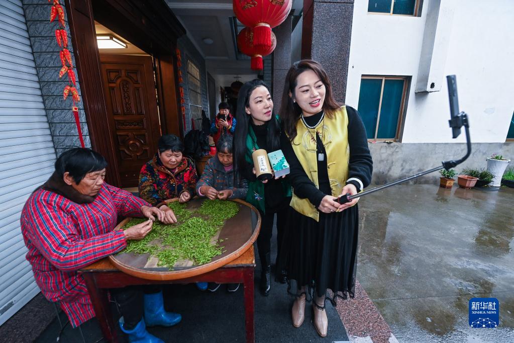 3月22日,两名女子在诸暨市赵家镇东庄村上阳自然村直播高山有机茶制作,助力网上销售。