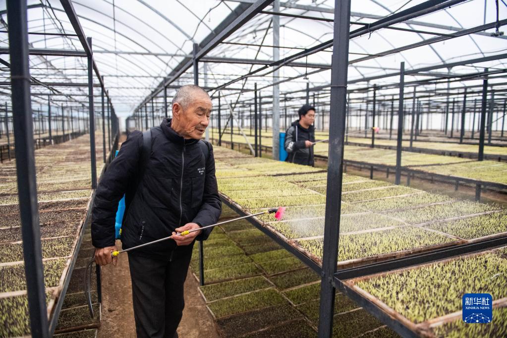 3月22日,在桃源县金凤桥水稻育秧工厂,村民给刚发芽的秧苗消毒。