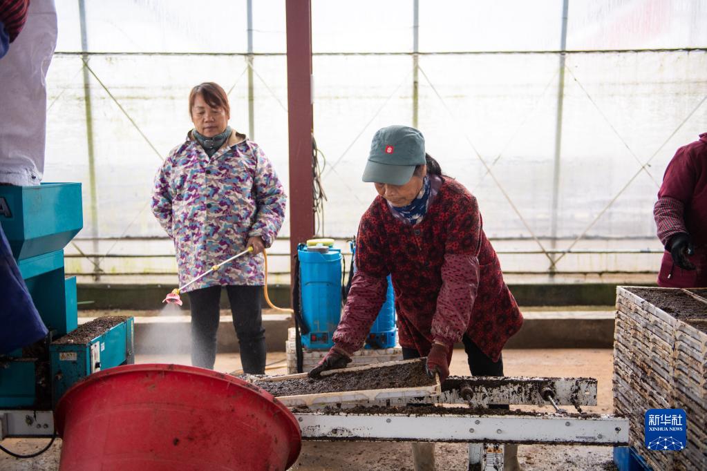 3月22日,在桃源县金凤桥水稻育秧工厂,村民在搬运秧盘。