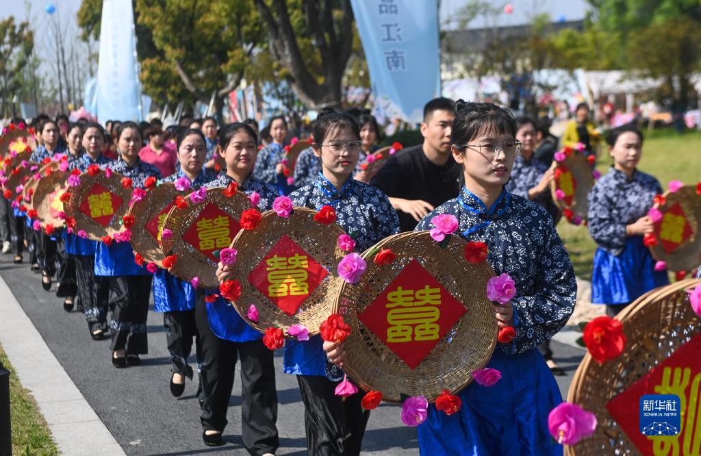 4月2日,人们参加蚕花节民俗巡游活动。