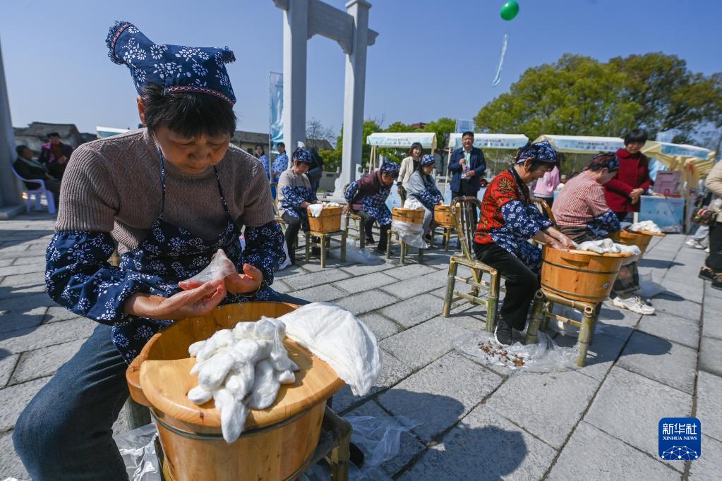 4月2日拍摄的蚕花节上的传统缫丝技艺展示。