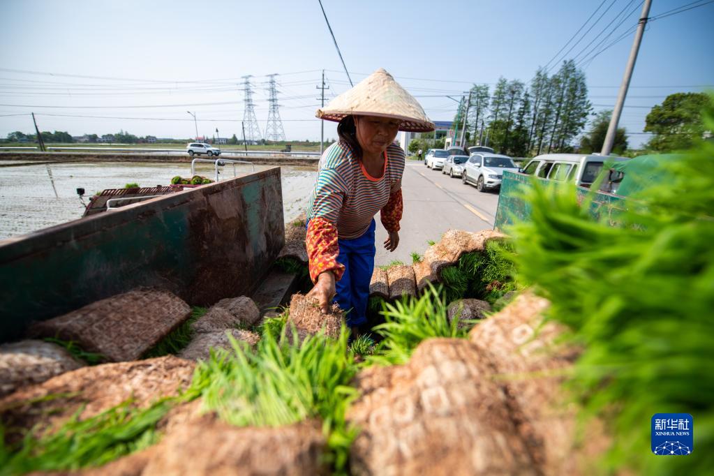 4月17日,在长沙市望城区乌山街道黄花岭村,村民在整理拖拉机上的秧苗。