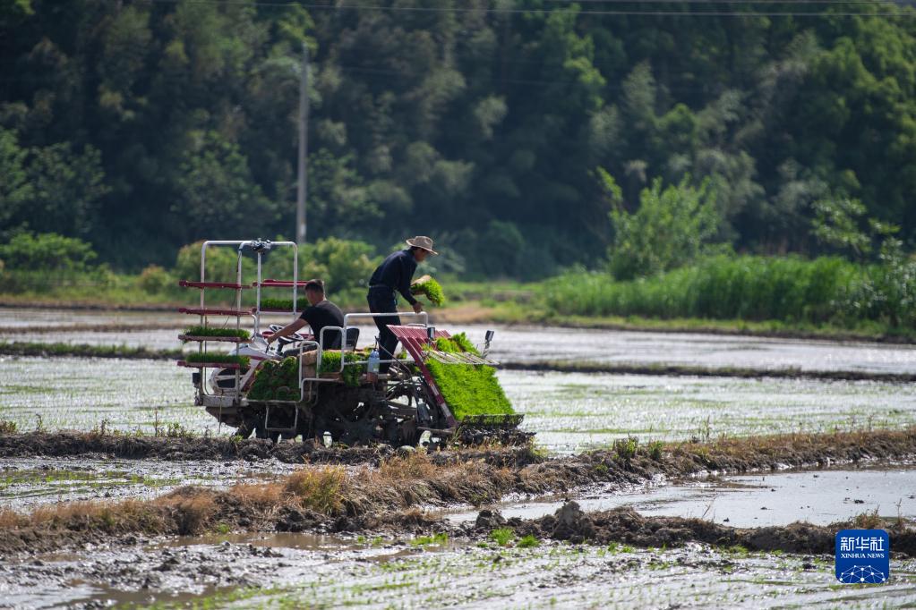 4月17日,在长沙市望城区乌山街道黄花岭村,村民驾驶插秧机进行水稻插秧作业。