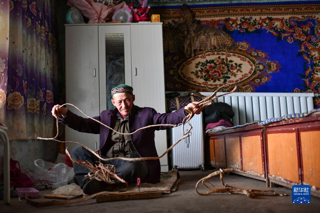 放牧归来,哈布得拉什么在家中用收购来的牛皮制作缰绳等放牧用具(2月11日摄)。这些用具将出售给其他有需要的牧民。