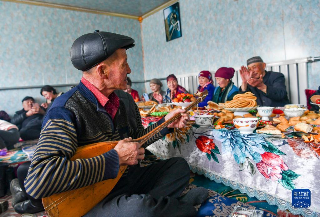 哈布得拉什么在“邻里聚会”上为亲朋好友弹奏冬不拉,引吭高歌(2月12日摄)。