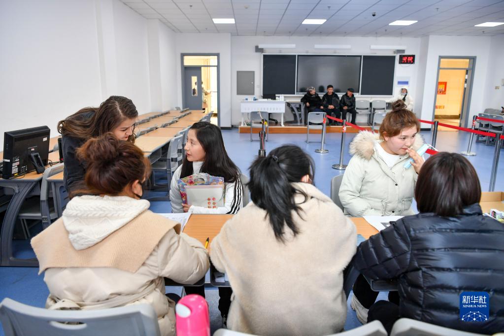 在新疆医科大学(雪莲山校区)教学楼内,昆树阿克(后排中)在办理入学手续,父母坐在不远处等候(2月18日摄)。