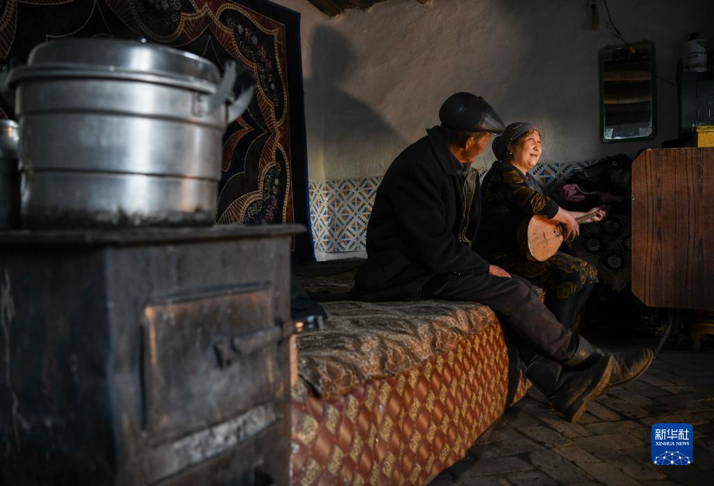 巴哈提和丈夫坐在家中休息,两人聊起在外上学的小女儿,巴哈提拿起冬不拉弹唱一首歌曲表达思念(4月13日摄)。