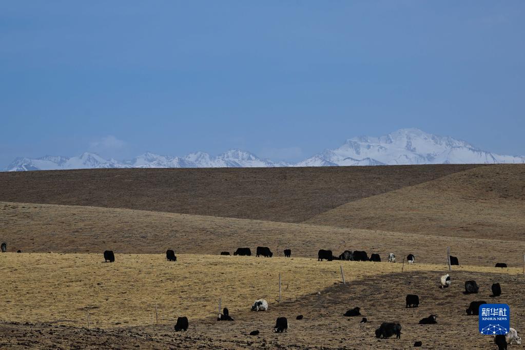 4月17日,在青海省海北藏族自治州门源回族自治县皇城蒙古族乡,一群牦牛在祁连山腹地的草场上活动。