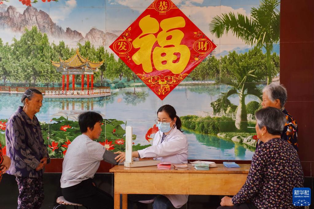 4月20日,河北省平乡县寻召村村医在“幸福小院”内为老人们量血压。