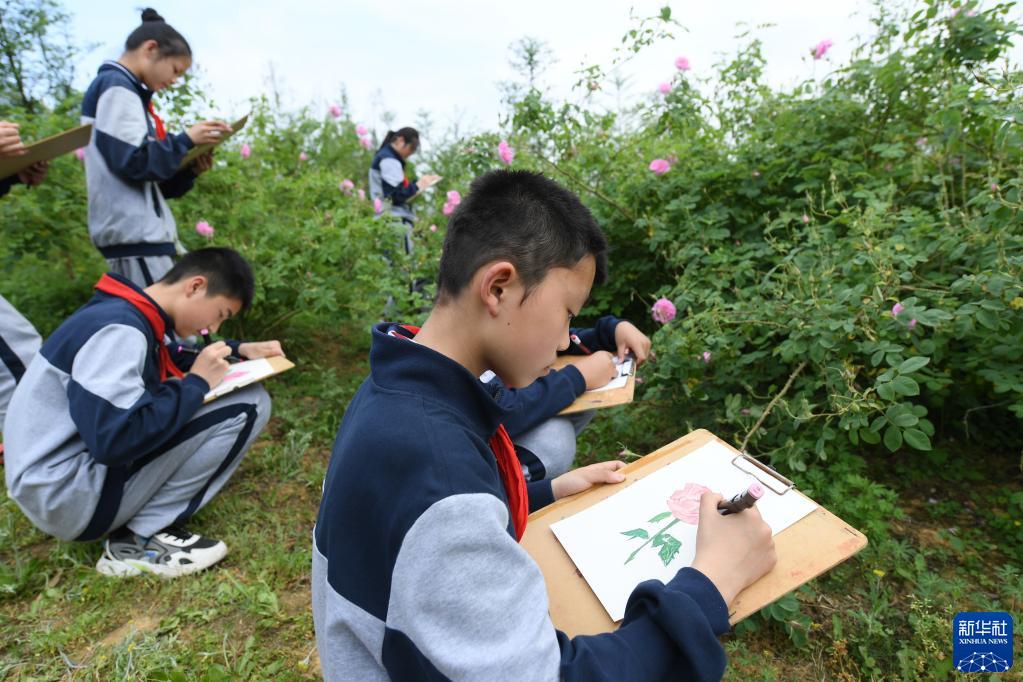 4月20日,埭溪镇上强中学的学生在玫瑰庄园写生。