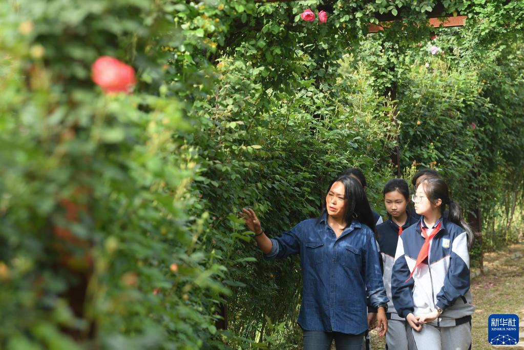 4月20日,玫瑰庄园的创始人季梅(左一)向前来研学的中学生介绍玫瑰品种。