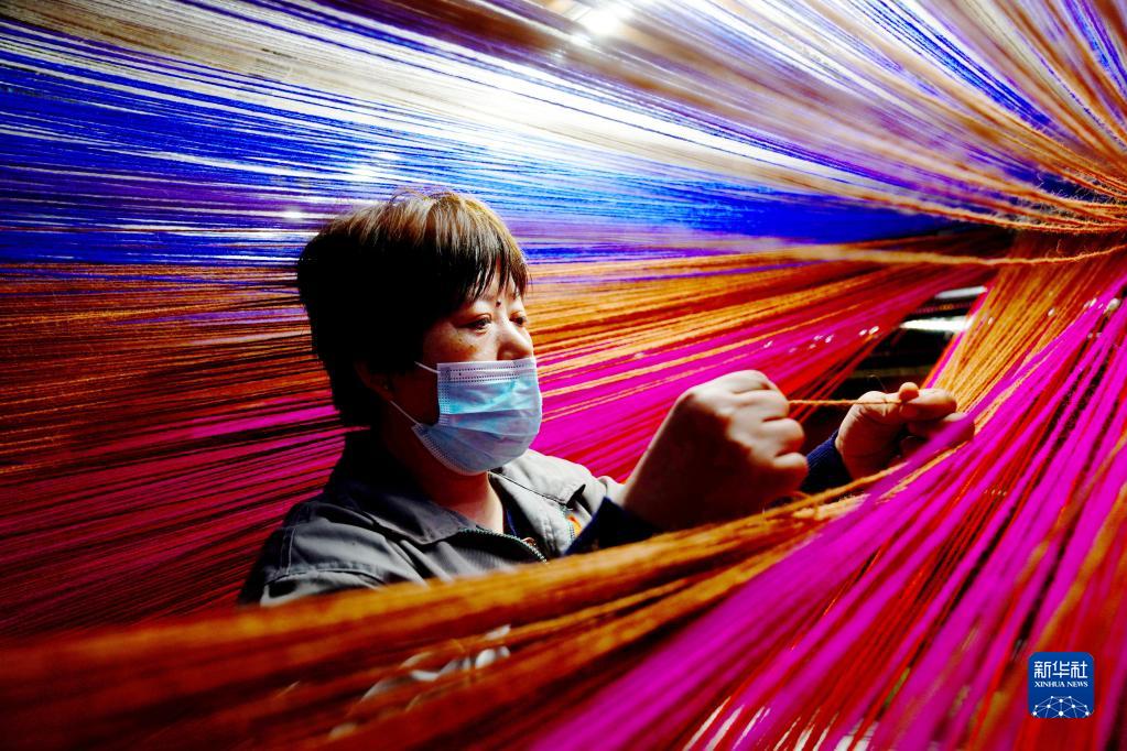 4月22日,在惠民县辛店镇“惠民工坊”,一名工作人员在接纺线。