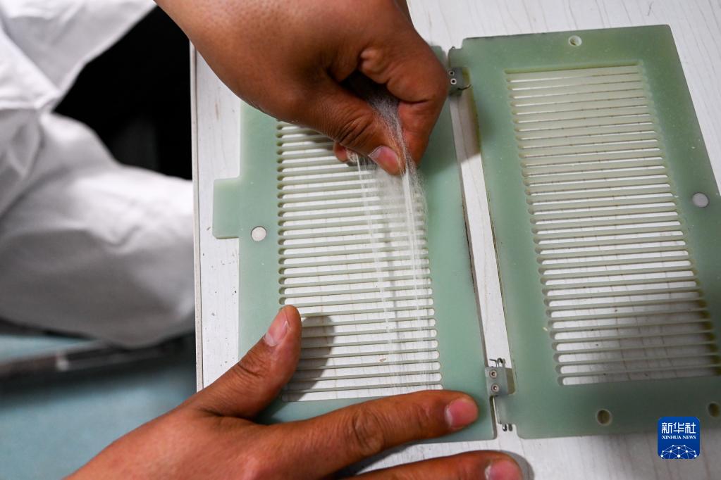 4月27日,在伊金霍洛旗苏布尔嘎镇敏盖绒山羊研究中心,技术员在进行羊绒细度检测。