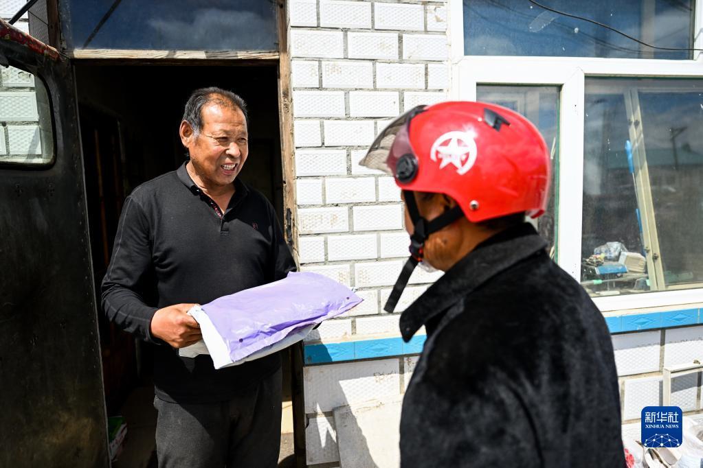5月13日,在阿荣旗孤山屯村,于庆柱(右)将快递送给行动不便的村民。