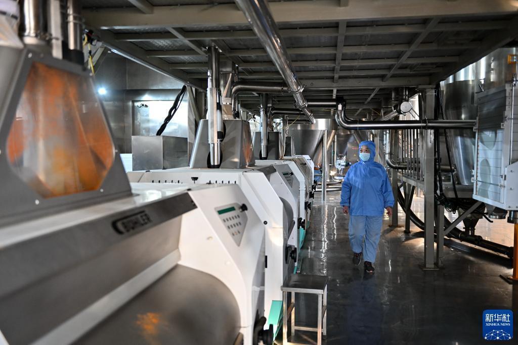 12月1日,河北省望都县一家辣椒加工企业的工人在辣椒面生产线上工作。